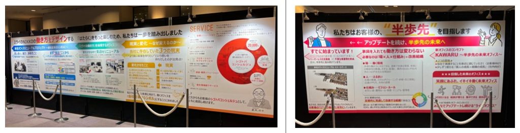 展示会場の入り口に入る前の通路、一番はじめには当社のサービス案内や取り組み、リニューアル事例パネルをご案内し、赤裸々に当社の進めていることをご紹介。規模、業種問わず参考になっていれば嬉しいです。