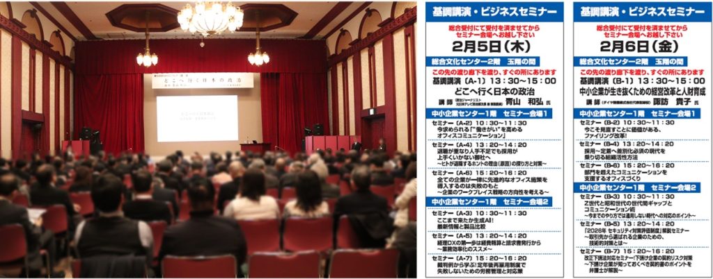 2026年2月5日(木)9:30〜18:00 2026年2月6日(金)9:30〜16:30 | ・あましんアルカイックホール・オクト (総合受付・展示会場) ・都ホテル 尼崎(展示会場) ・尼崎市総合文化センター(基調講演会場) ・尼崎市中小企業センター(ビジネスセミナー会場) |