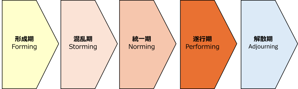 - 遂行期(Performing):高いチームワークを発揮。効率的に目標達成へ向かう。