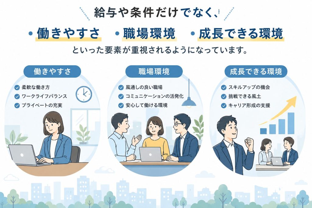 給与や条件だけでなく、・働きやすさ・職場環境・成長できる環境といった要素が重視されるようになっています。