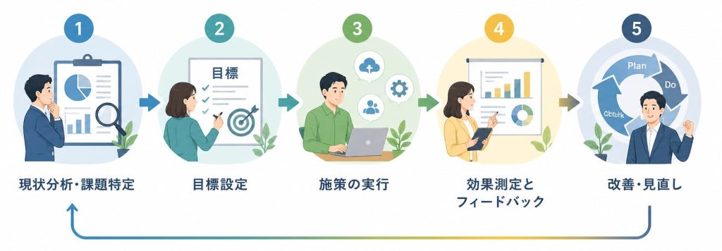 - 改善・見直し:PDCAサイクルを回し、環境やニーズの変化に合わせて柔軟に戦略を調整し続けます。