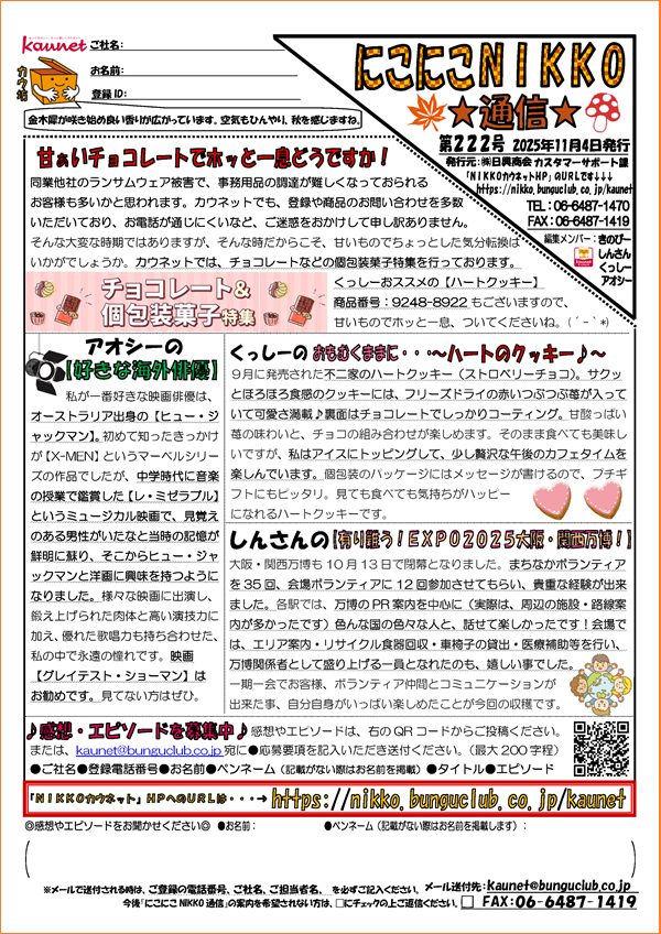 NEW NIKKOカウネット 2025.11.12 にこにこNIKKO通信第222号発行! ↓クリックするとPDFファイルが開きます にこにこNIKKO通信のバックナンバーはコチラですhttps://nikko.bunguclub.co.jp/news/kaunet/ 前の記事