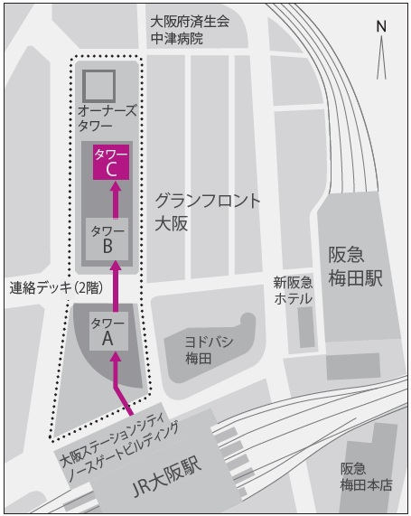 JR大阪駅からは2階連絡デッキからタワーBまで行き、