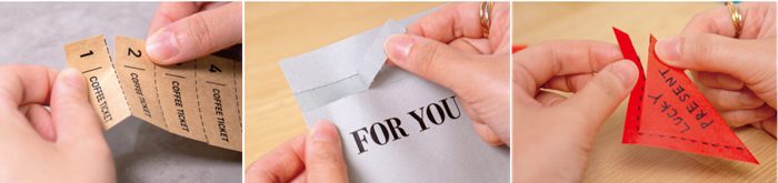 ミシン目カッターは、イベントの小物づくりや、贈り物のラッピングなどに大活躍します。