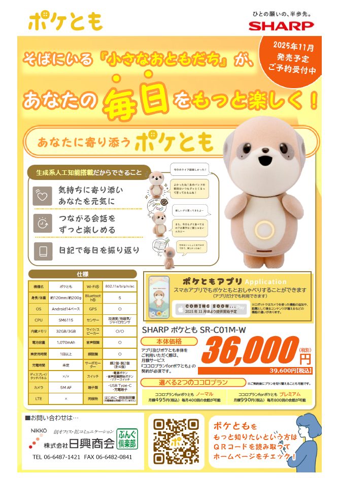 ポケともと会話を楽しんだり、会話内容を記憶したりするために、必ず月額利用サービス「ココロプラン for ポケとも」の加入が必要です。
