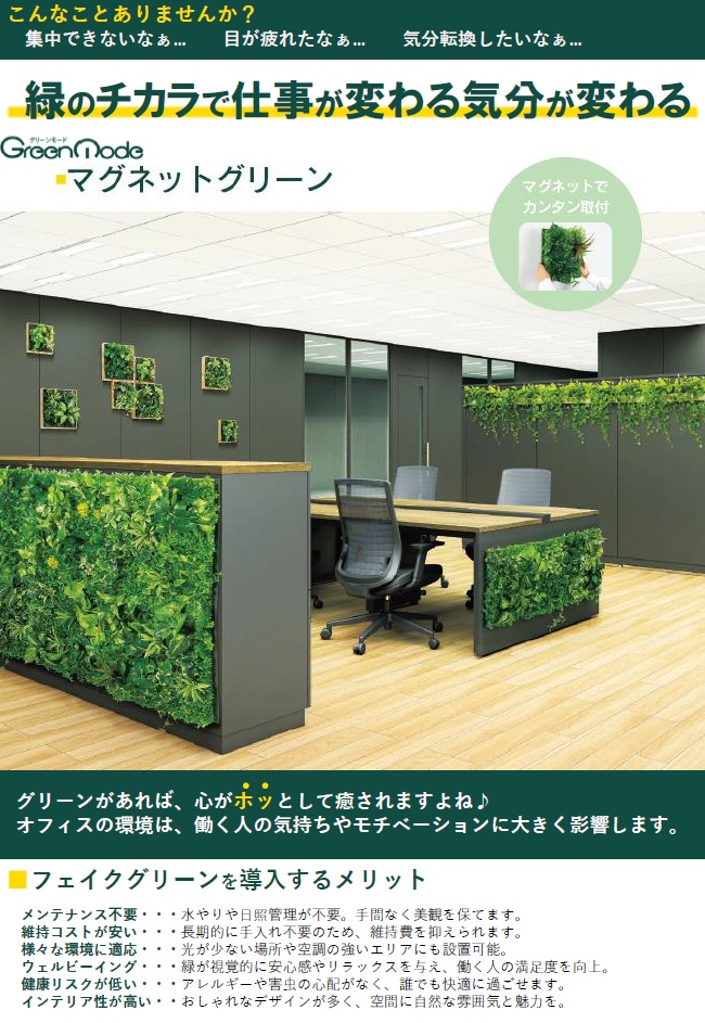 マグネットグリーンは、パーテーションや家具などのスチール面に貼るだけで、手軽にオフィスを緑化できるインテリアアイテムです。工事不要で、無機質な空間に安らぎとデザイン性を簡単にプラスし、緑視率をアップします。