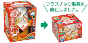 プラスチック製橙(だいだい)を紙製に変更し、化粧箱のプラスチック製窓も廃止して、プラスチック使用量を削減しました。また、お客様に三方を組み立てていただくことで、箱サイズを小さくし、配送時のCO2削減に貢献します。
