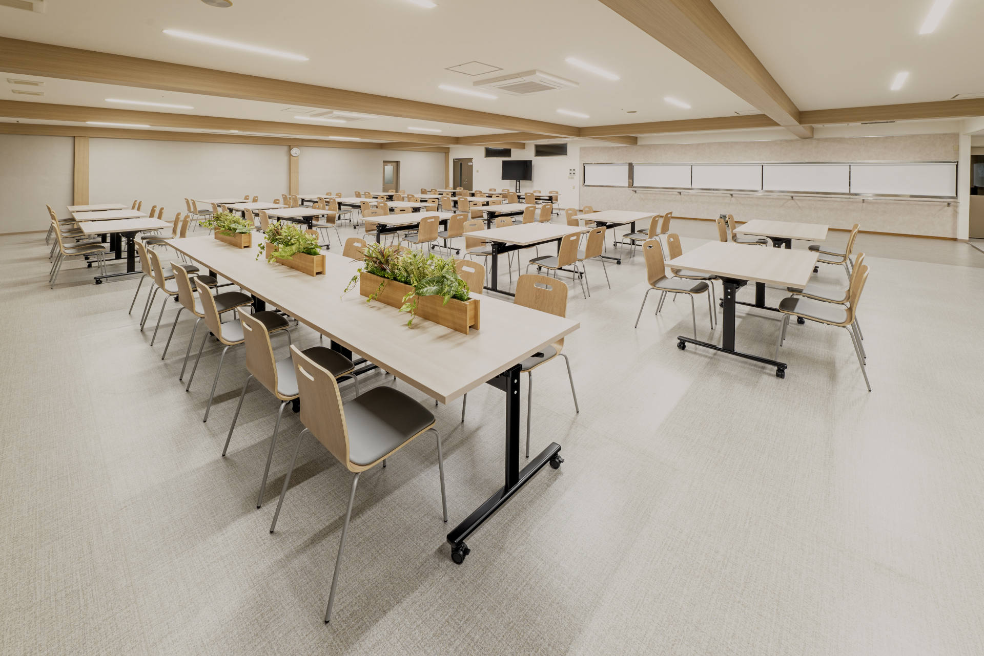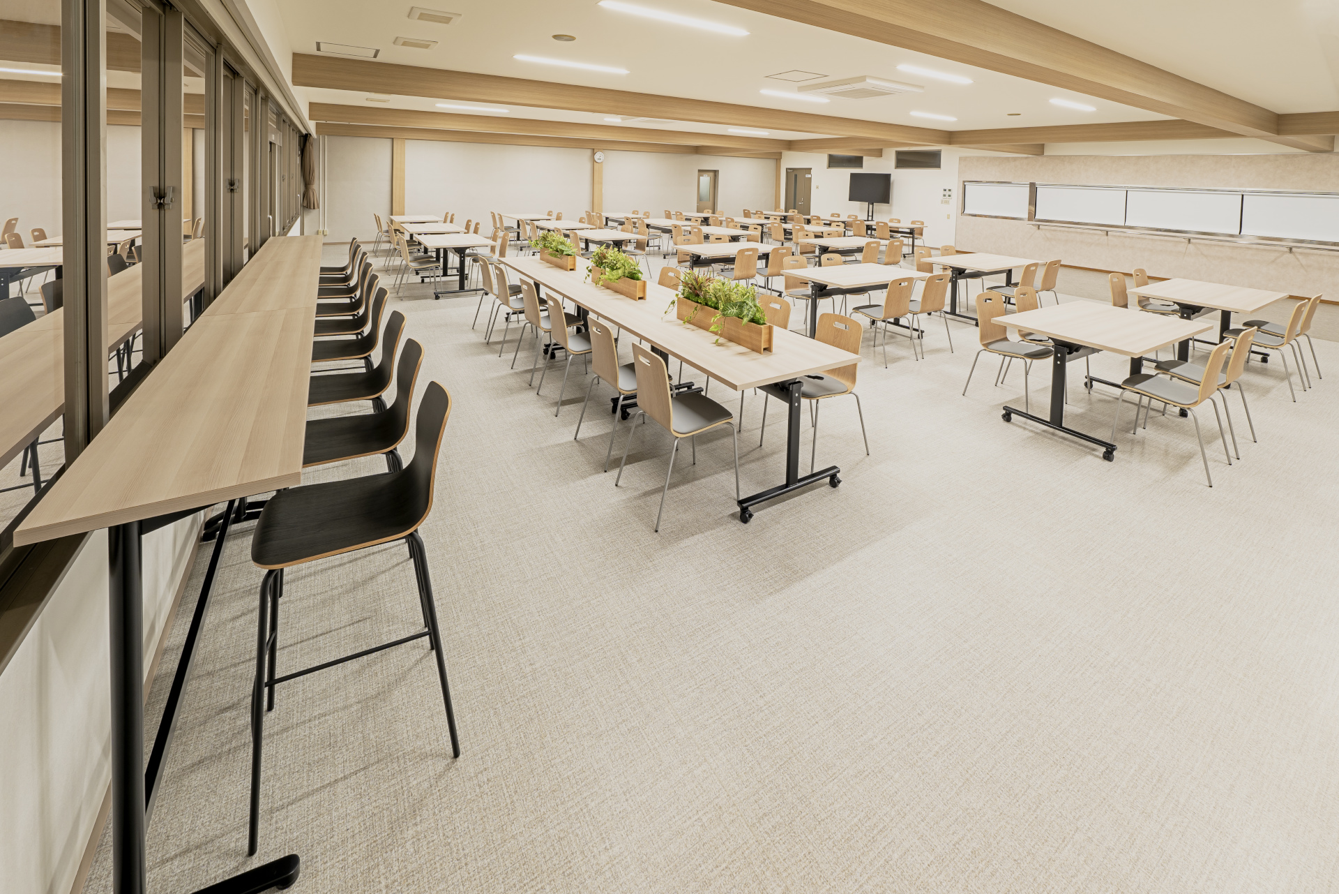 食堂全体の使い勝手と快適性を高めるため、家具の入替だけでなく、床・壁・天井といった内装全体も含めて、提案させていただきました。家具選定から内装計画までを一体で検討することで、空間全体に統一感を持たせたトータルコーディネートを実現。日々多くの従業員の皆さまが利用される場所だからこそ、居心地の良さと機能性を兼ね備えた空間へと生まれ変わりました。