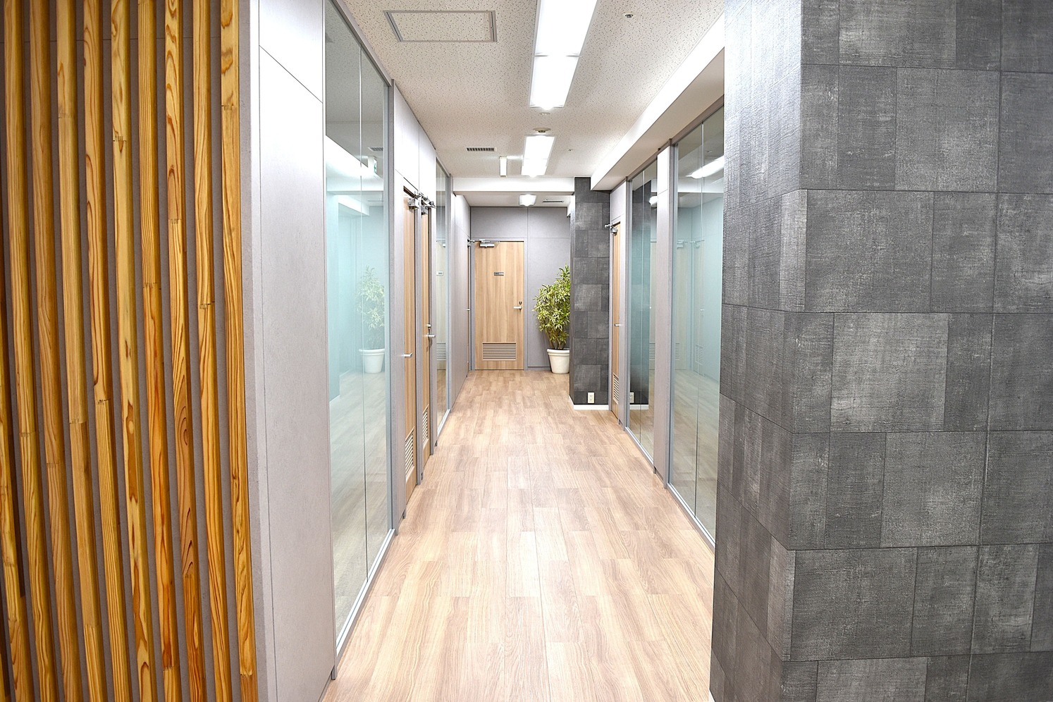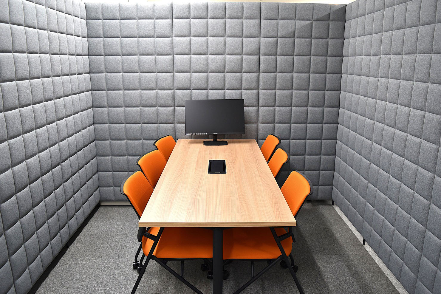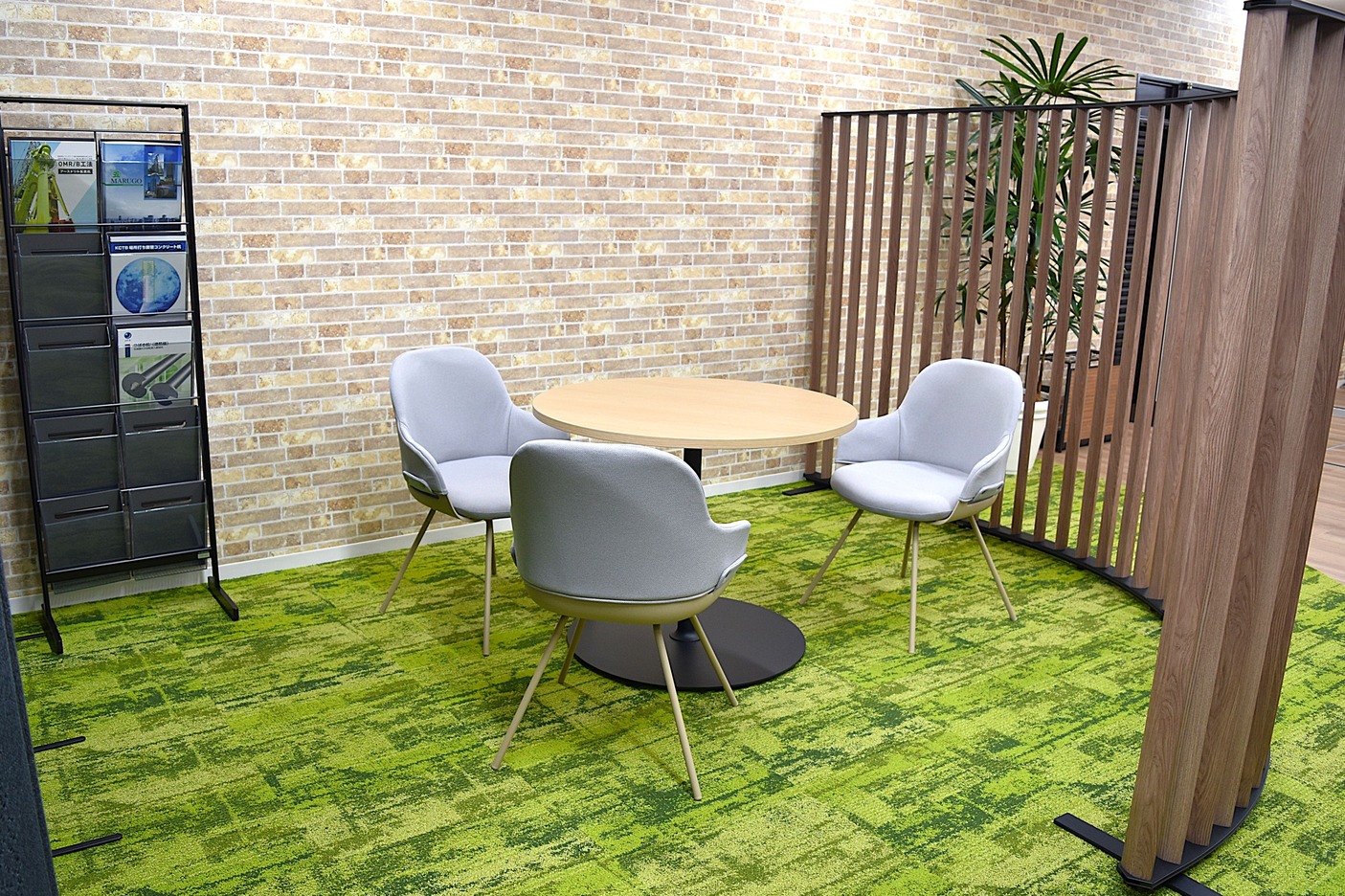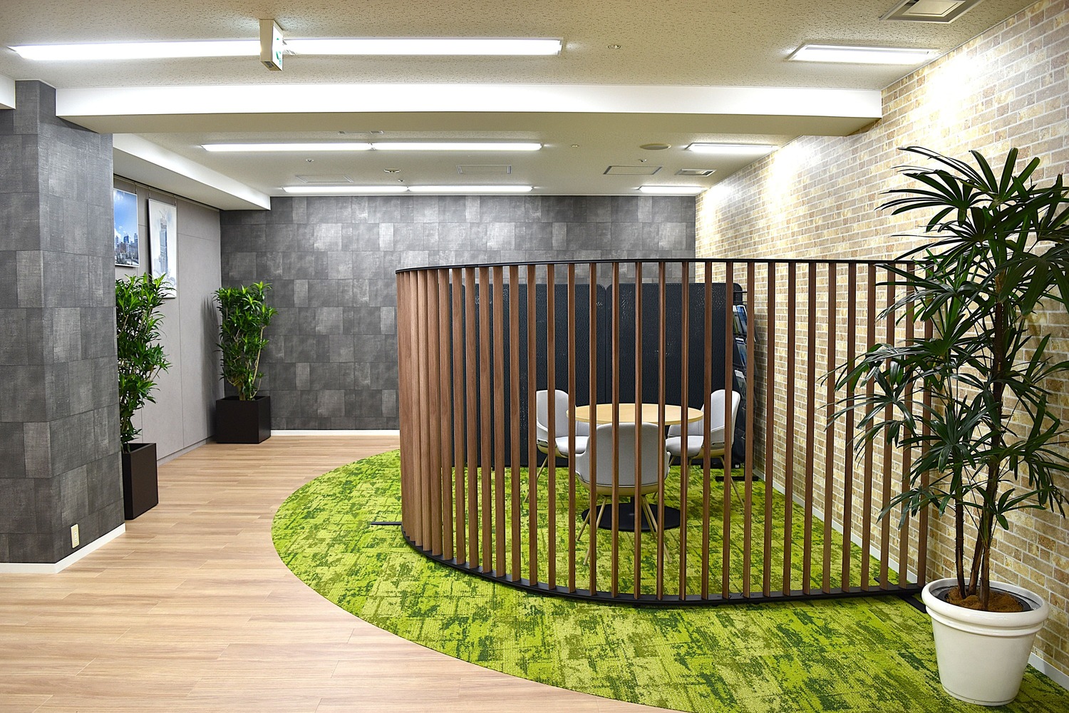 内装には木目調素材やルーバー(羽板と呼ばれる木材)を取り入れ、温かみのある落ち着いた雰囲気を演出。通路には透過性のガラスを採用し、明るさと開放感を高めています。新設の防音ブースでは周囲を気にせず打合せが可能となり、機能面も向上。会議室の家具も統一され、レイアウト変更や移動がしやすく、日々の使い勝手も改善されました。
