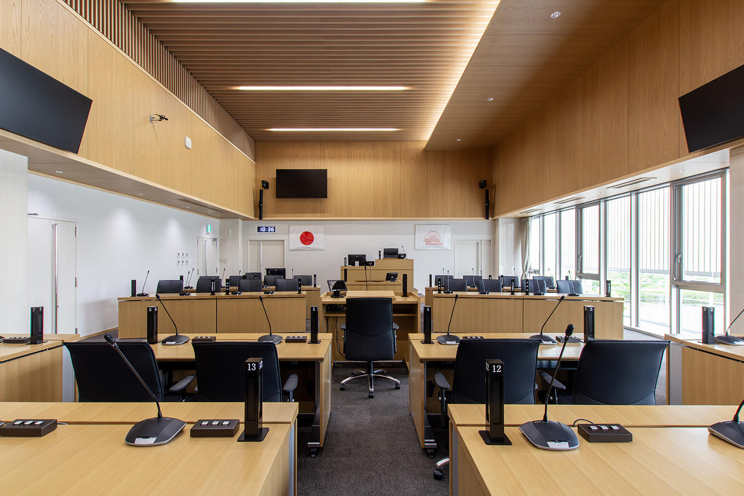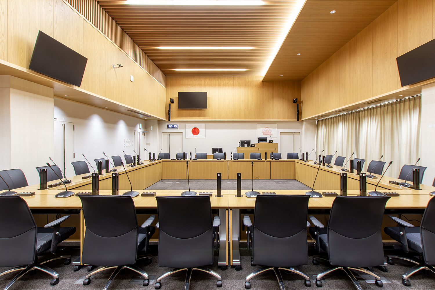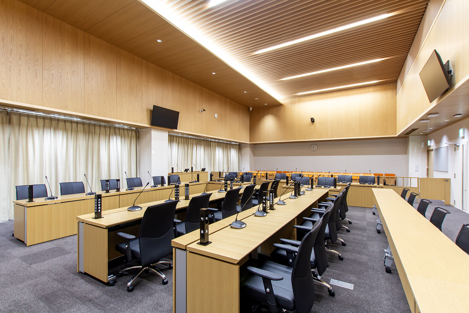 新庁舎建設事業の中で、弊社は町の議会などが開かれる議場づくりをお手伝いさせていただきました。
